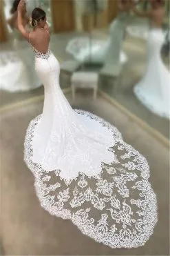 Mermaid Spaghetti Sleeveless Appliqued Lace Court Train Wedding Dresses