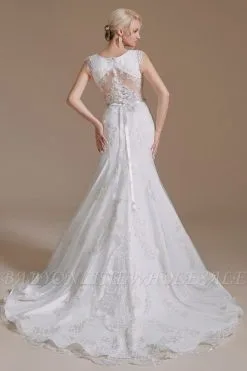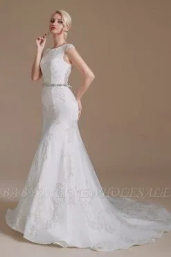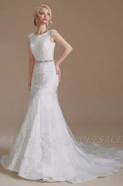 Looking for in Lace, Mermaid style, and elegant Lace work? Babyonlinewholesale has all covered on this unique White Sleeveless Mermaid Wedding Dress Floral Lace Bridal Dress wit Belt.