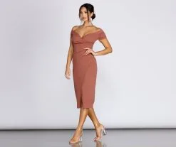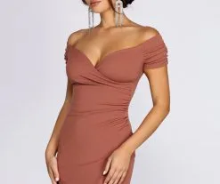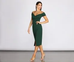 Stunningly timeless, Addison brings an elegant aura to your special moments! She features an off the shoulder neckline, a wrapped sweetheart bust, off the shoulder cap sleeves with ruched detailing and a midi length silhouette with an asymmetrical hem. Dress is composed of a lined crepe fabric that offers a curve hugging fit with a moderate stretch.