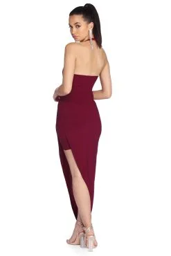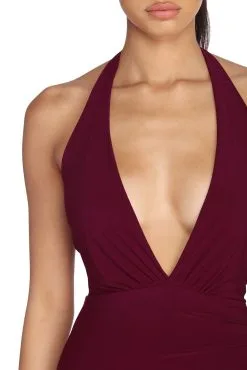 Take the plunge as you make a statement in our bold Adelynn dress! She features a burgundy hue, a plunging V neck, a ruched side seam on the left and an asymmetrical high slit complemented with a mini skirt length lining. Dress is composed of a lined smooth knit fabric that offers a form hugging fit with a moderate stretch.