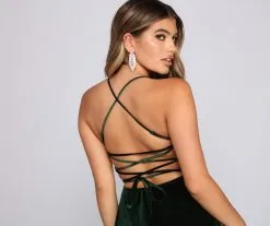 Luxe and so on-trend, you’ll fall in love with the Amelia velvet skater dress. She features a sleeveless square neckline with a padded bust, spaghetti straps that lead to a cross-back lace-up design, a flattering high waist, and a flirty skater skirt. Style this chic dress with rhinestone earrings and