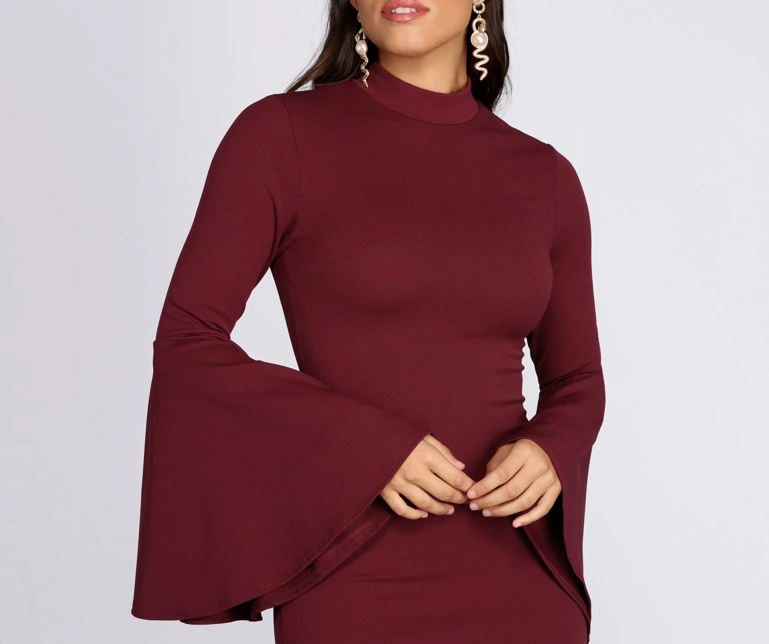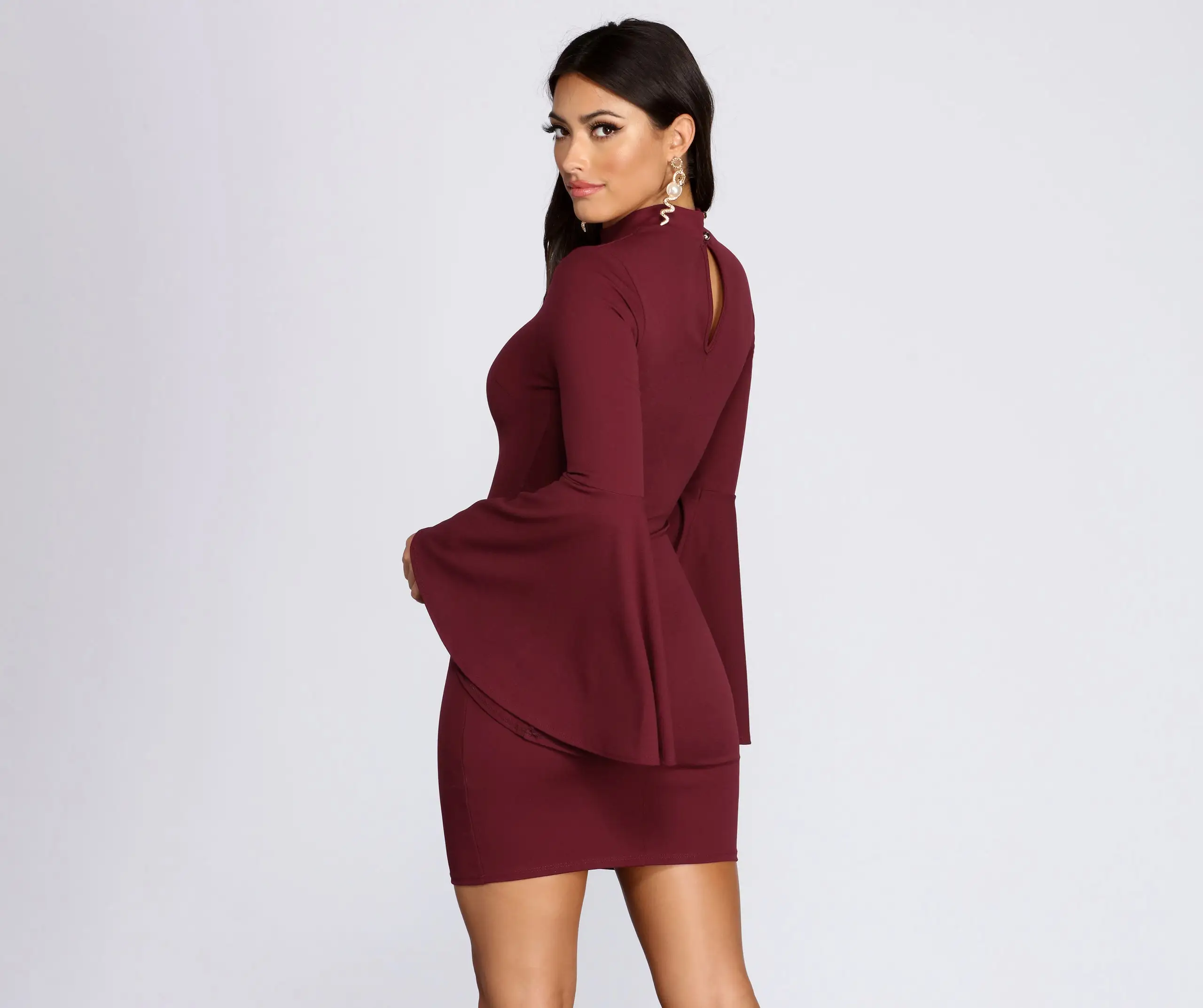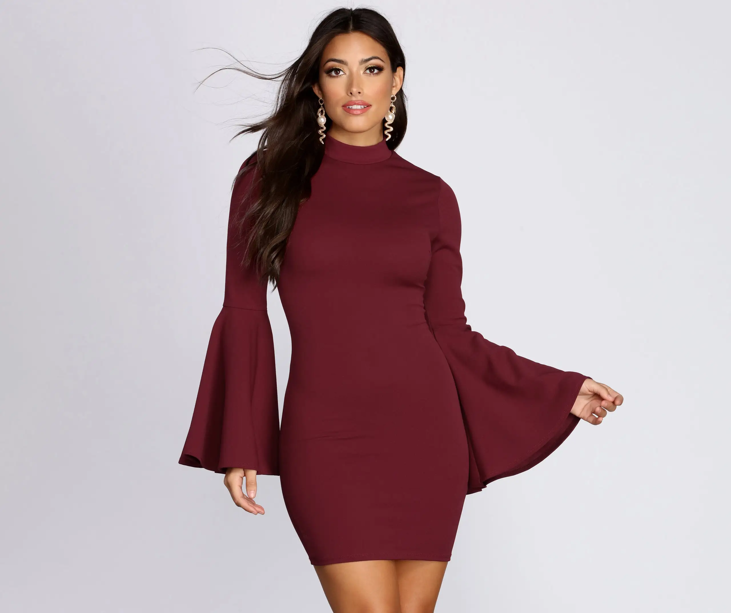 Keep it sweet and charming in this pretty mini! It features a mock neck, bell sleeves and a mini length silhouette. The back features a small keyhole with a double button closure. Dress is composed of a lined crepe fabric that offers a form hugging fit with a moderate stretch.
