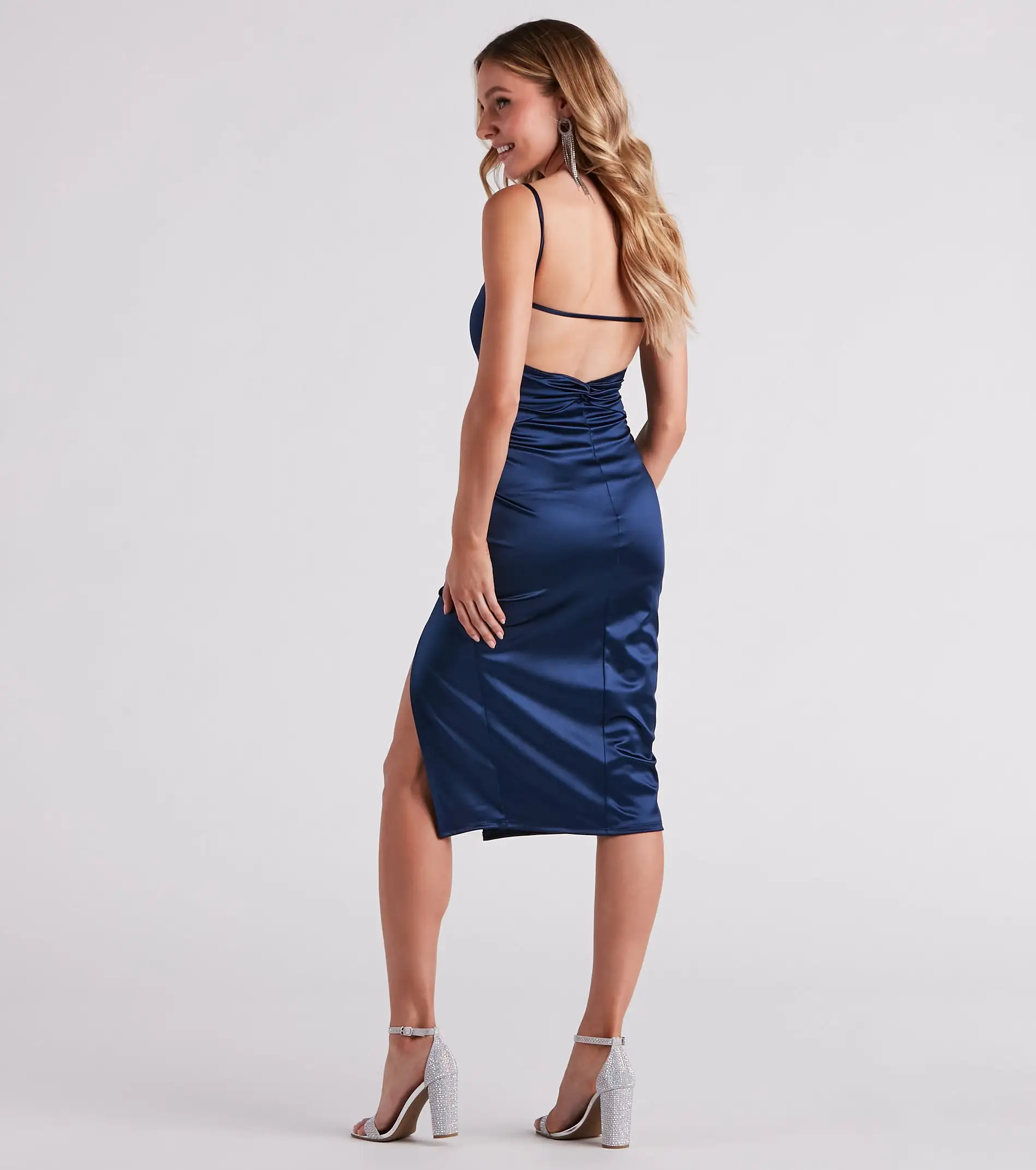 Make your next cocktail party a chic affair with this sleek satin midi dress. It features a sleeveless square neckline, spaghetti straps, an alluring open back with a bar strap accent, a lower back ruched knot detail, a midi-length hem with a high front slit, and a form-hugging silhouette. The satin-knit fabric offers a moderate stretch. Complete your look with