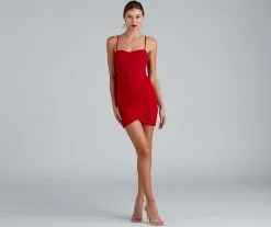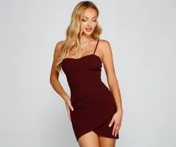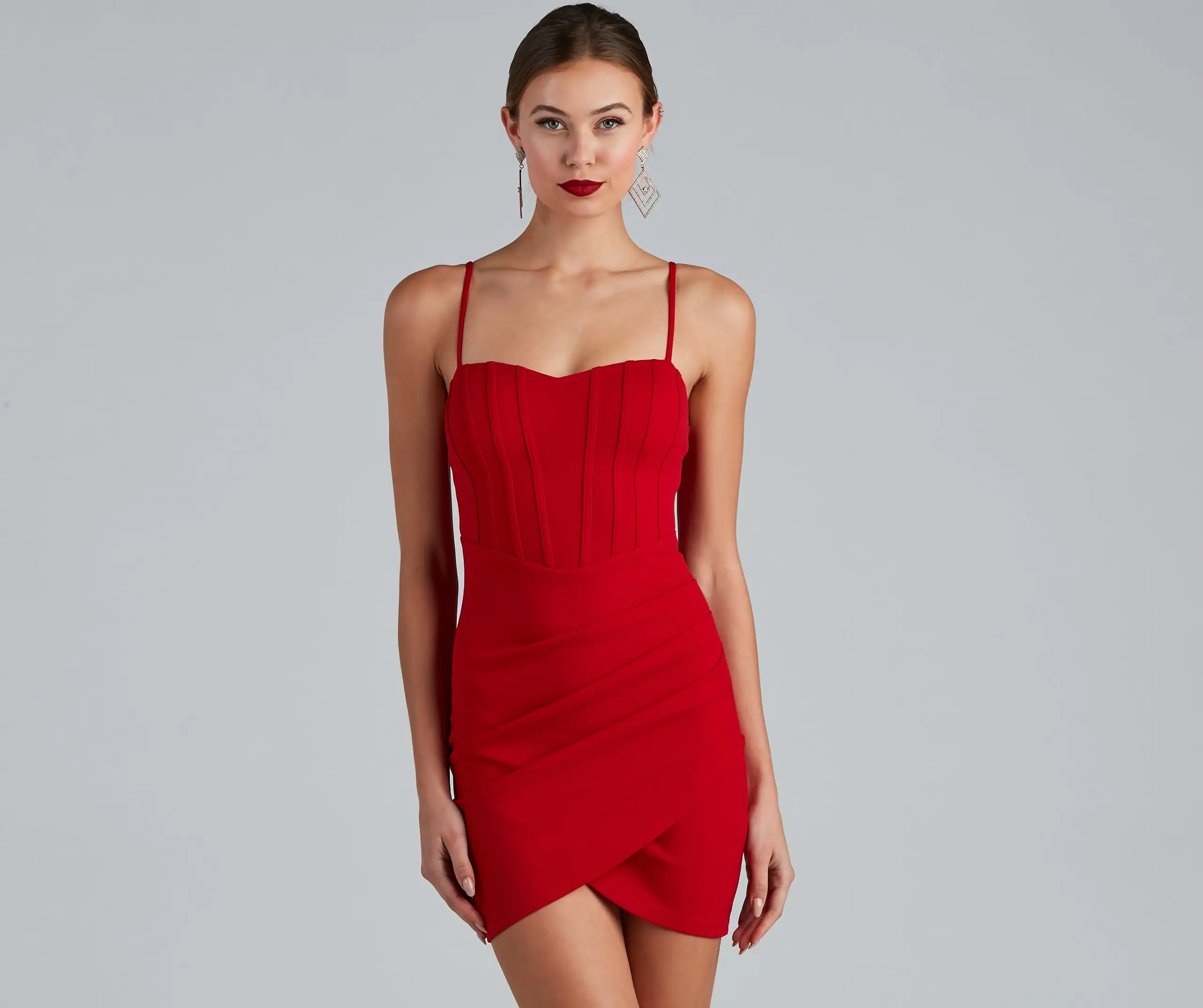Showcase your beauty in this chic of-the-moment mini dress. It features a sleeveless sweetheart neckline, spaghetti straps, a corset-designed bodice, and a mini-length, curve-hugging silhouette with a wrap-front skirt. Style this dress with a