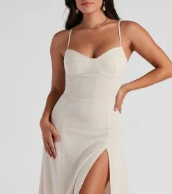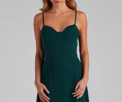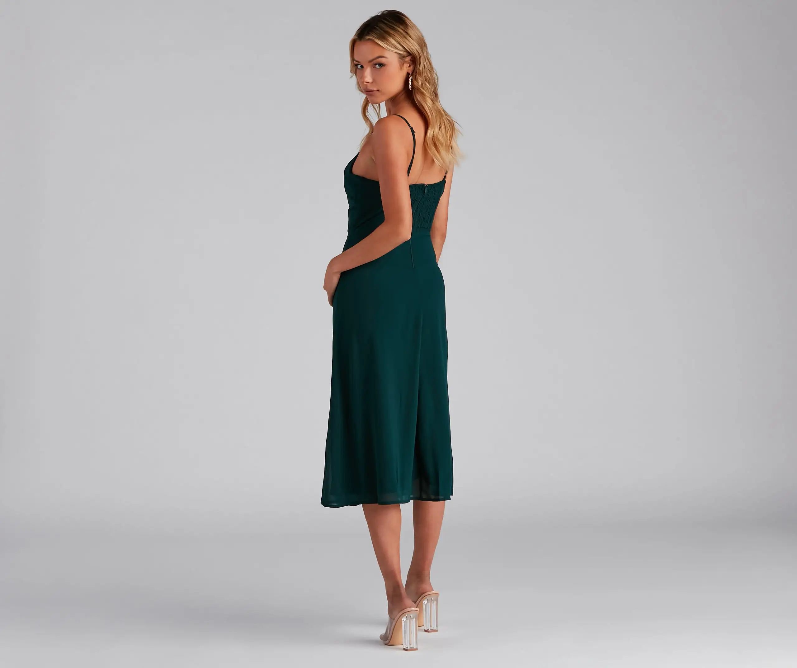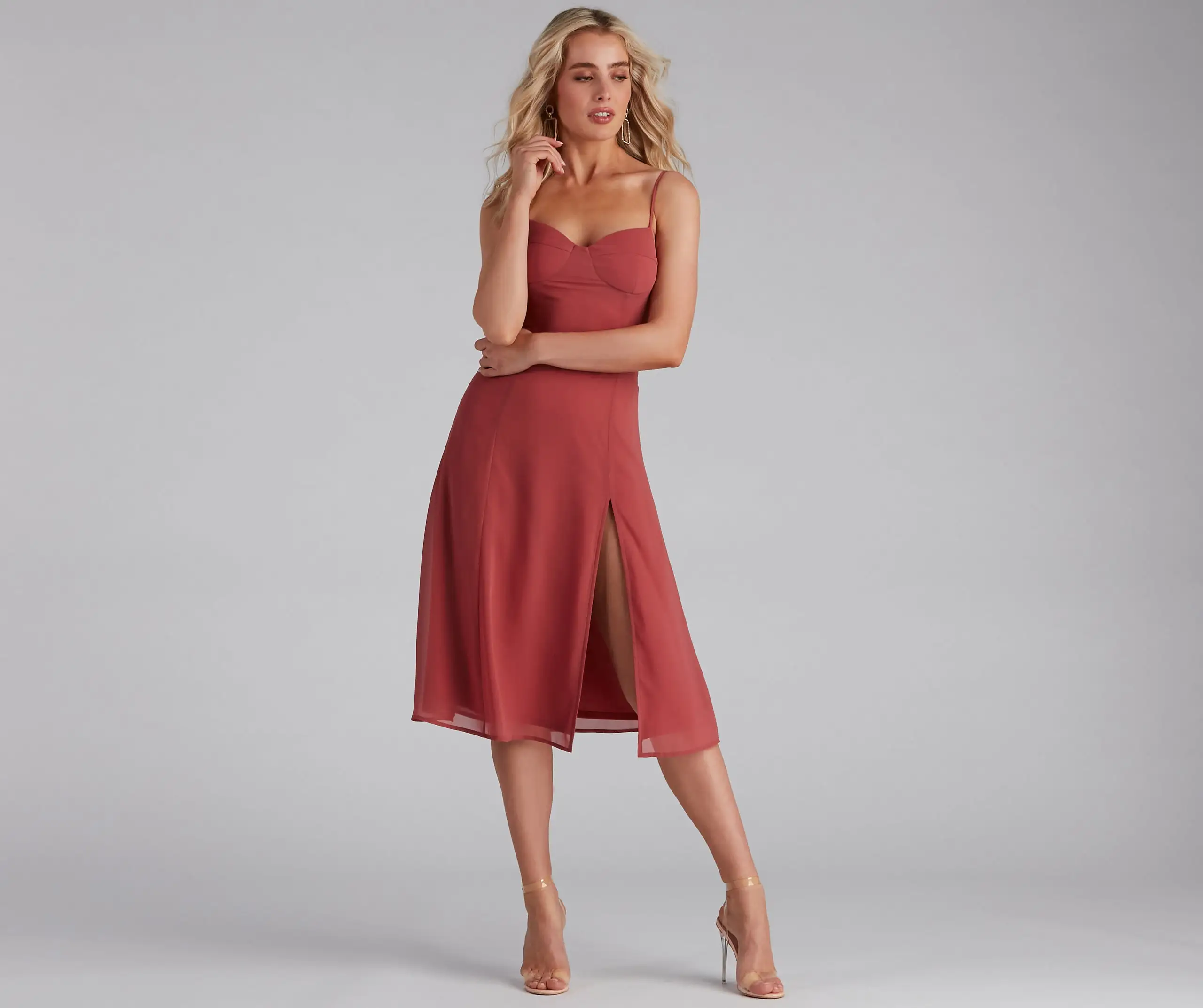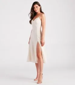 Get the perf semi-formal look in this effortlessly chic chiffon midi dress. It features a sleeveless sweetheart neckline with a padded bust, spaghetti straps, a flattering high waist seam, and a mid-length skirt with a front slit and a flowy A-line silhouette. Style this dress with sleek earrings and