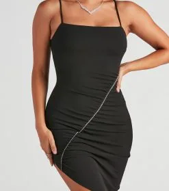 Showcase a chic sparkle in this fitted crepe midi dress. It features a sleeveless square neckline, adjustable spaghetti straps for a customized fit, a rhinestone embellished asymmetrical trim across the front, ruching, and a midi-length, form-hugging fit with an asymmetrical cut hem. Style with