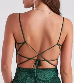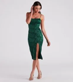 This alluring floral lace midi dress is totally date night approved! It features a sleeveless square neckline, spaghetti straps, an open back with a strappy lace-up design for a customized fit, a midi-length hem with a high front slit, and a form-hugging silhouette. The sheer lace fabric includes a full knit lining. Style with sleek