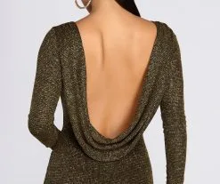 - Dramatic open back with draped accent