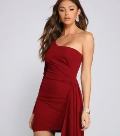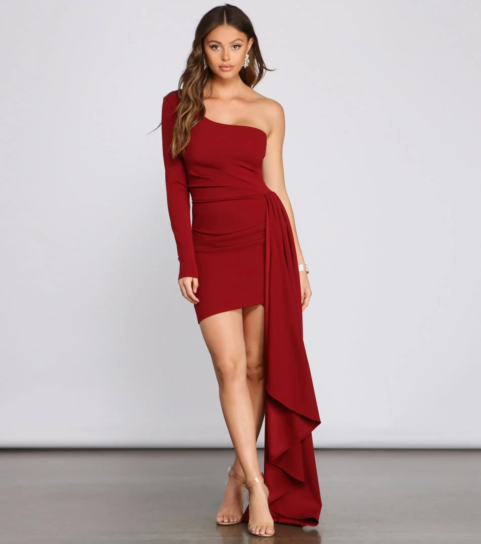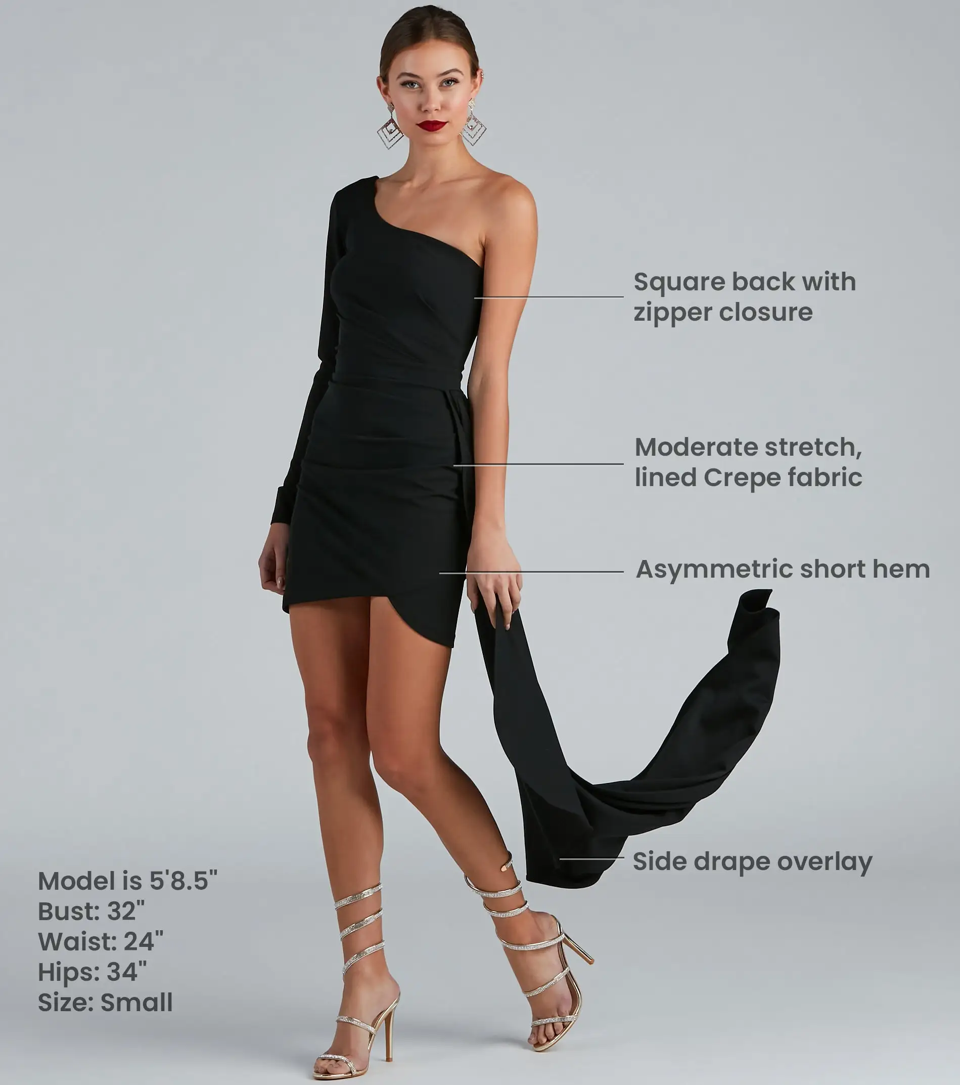 Showcase your bride-to-be status in our chic Emily mini dress for your upcoming engagement party! She features a one-shoulder neckline with a single long fitted sleeve, a back zipper closure, an asymmetric, mini-length, curve-hugging silhouette, and a dramatic side skirt overlay. The dress is composed of a crepe fabric with a knit lining and offers a moderate stretch for comfortable wear. Complete your look with rhinestone earrings and a