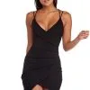 Keep your dinner date outfit enchanting and chic in this smooth velvet mini dress. It features a sleeveless V-neckline, spaghetti straps, pleated detailing at the side, a faux wrap design, and an asymmetrical mini-length hem. The velvet fabric offers a moderate stretch with a form-hugging, bodycon silhouette. Complete your look with