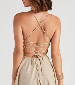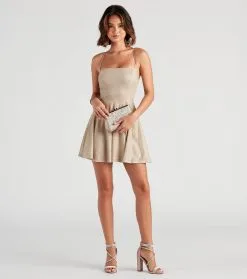 Enchant the room with magical shine! This skater dress features a sleeveless square neck, adjustable spaghetti straps, a lace-up open-back design, and a short-length hem on glitter woven fabric. Complete the look in lace-up