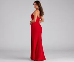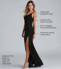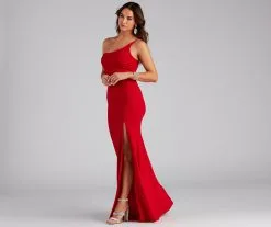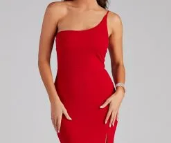 Bring the glamour in our chic Fiona formal dress that brings sophistication. She features a one-shoulder neckline, an adjustable spaghetti strap, and a floor-length mermaid silhouette accented with a high side slit for a sexy display of leg. The dress is composed of a crepe fabric that offers a form-hugging fit with a moderate stretch. Complete your special occasion outfit with a luxe