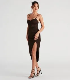 Flaunt your gorgeous figure in this curve-hugging glitter mesh midi dress! It features a sleeveless sweetheart neckline, adjustable spaghetti straps for a customized fit, ruching down the side seams, a midi-length hem, and a chic front slit to showcase some leg. The sparkly sheer glitter mesh fabric includes a full lining. Complete the look with