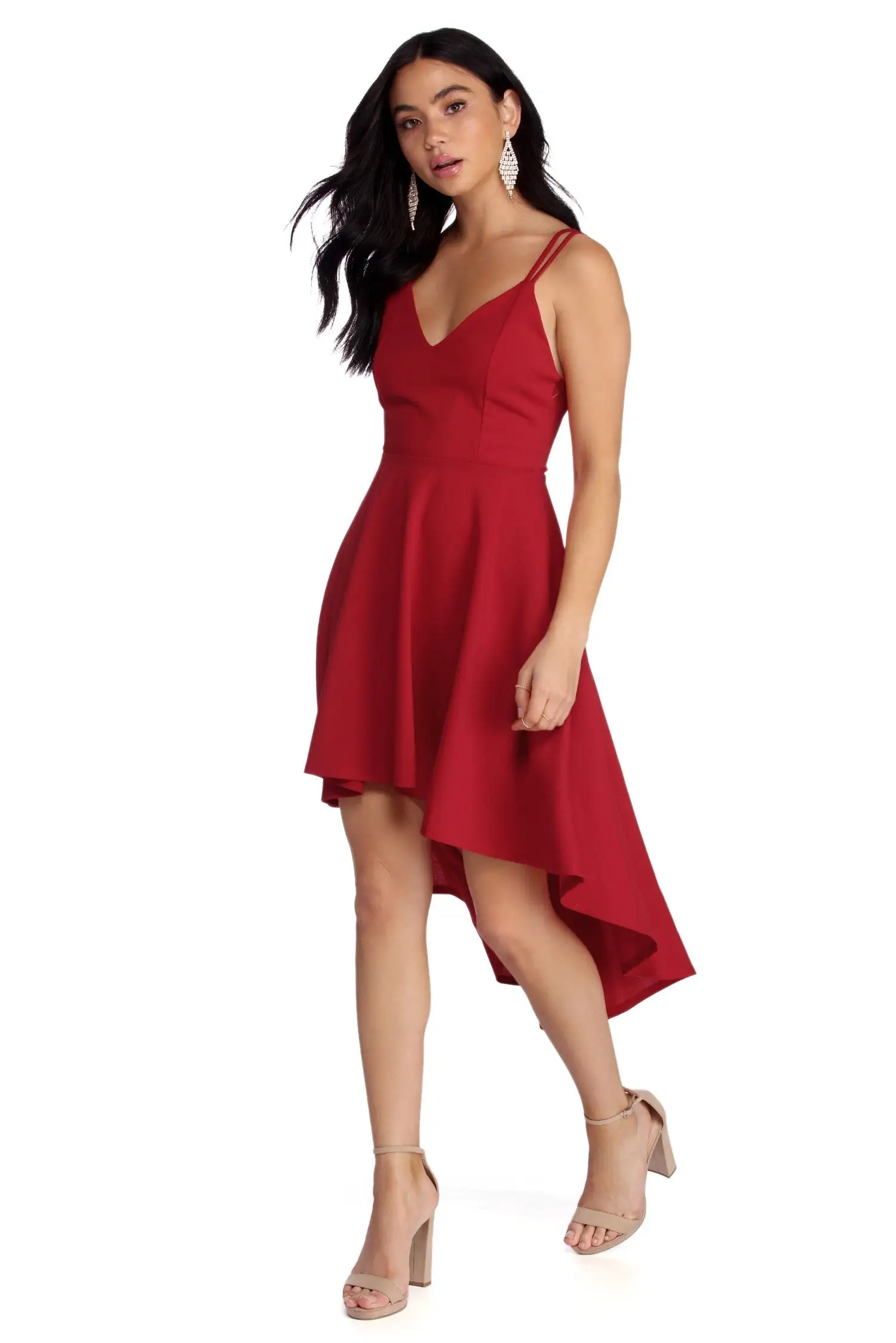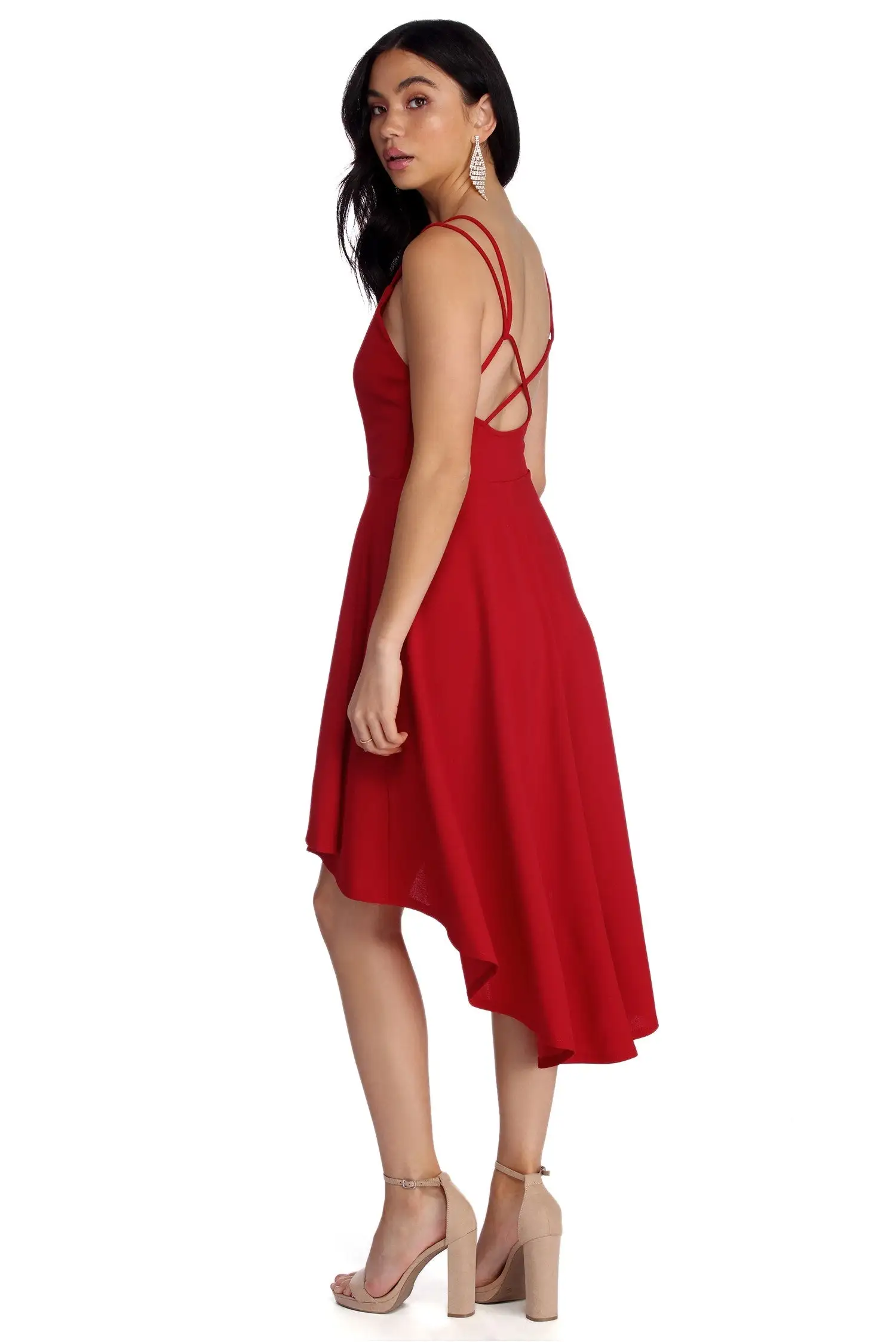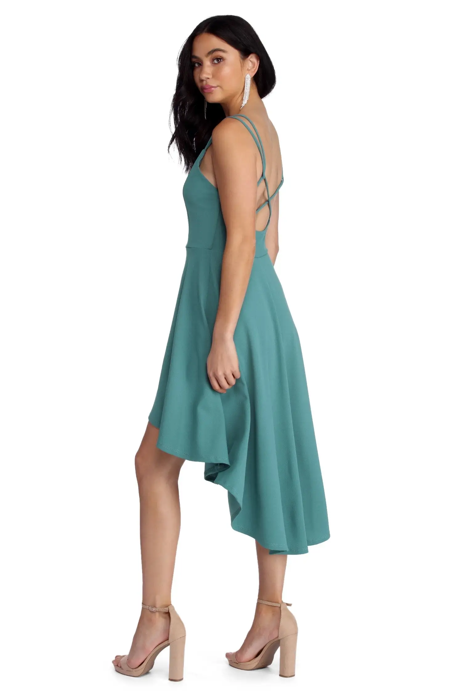 Leave a flirty impression in this adorable flowy high-low dress! It features a sleeveless bodice, spaghetti straps with a cross design in the back, a V neckline, seam detailing, a fitted bodice, and a skater skirt with a high-low hemline. The teal hued dress is composed of a crepe fabric that offers moderate stretch.
