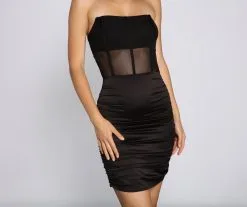 Head out with the squad in a mini dress that is perf for a memorable GNO! The dress features a sleeveless square neckline, a partially sheer bodice, piping accents, and a mini-length silhouette. The dress is composed of a contrast satin and mesh fabric that offers a form-hugging fit with minimal stretch. Complete look with stilettos and a