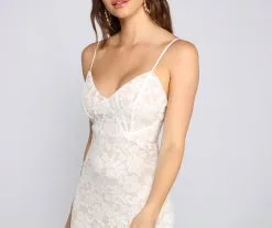 Keep it glam with a lace mini dress that is part delicate, part sultry. The dress features a sleeveless V-neckline, adjustable spaghetti straps, a corset-like bodice with piping, a floral lace body, and a mini-length silhouette. Complete look with