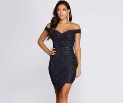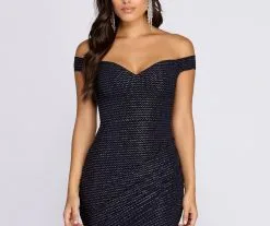 Radiate a glowing look in this glam mini dress! It features an off the shoulder neckline, a sweetheart bust, a built in no slip strip and a mini length silhouette with an asymmetrical hem. Dress is composed of a luxe glitter knit fabric that offers a form hugging fit with a moderate stretch. Includes a back zipper closure.