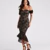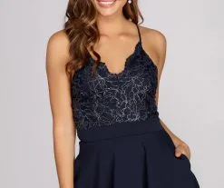 Grace them with your presence in lovely lace! This skater dress features a sleeveless bodice, a V neckline with a lace trim and narrow straps that lead to a cross back design. The bodice features an all over lined floral lace fabric with a metallic outline and leads to a multi layered skater length skirt with hidden side pockets. Dress is composed of a combination crepe and lace fabric that offers a form hugging fit with a moderate stretch.