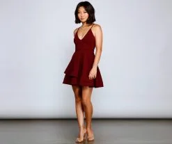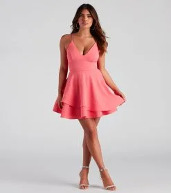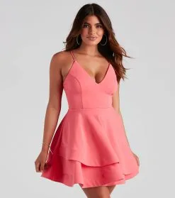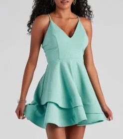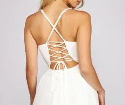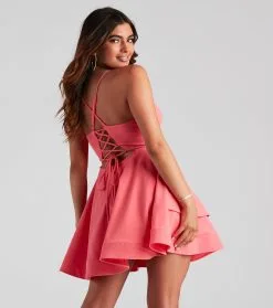 Get ready to celebrate in style in the adorable Isabella skater dress! She features a sleeveless V-neckline, adjustable spaghetti straps that lead to a cross-back, lace-up design, a high waist, and a short layered skater skirt with a flirty, flowy silhouette. Pair this dress with