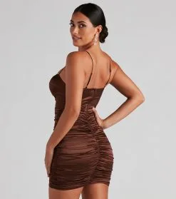 Bring that it girl energy to your look in this sleek satin mini dress. It features a sleeveless sweetheart neckline with a twist-front design, a built-in padded bust, a center keyhole cutout, spaghetti straps, ruched detailing down the sides, and a short, curve-hugging, bodycon silhouette. Style with