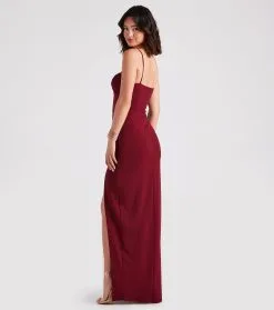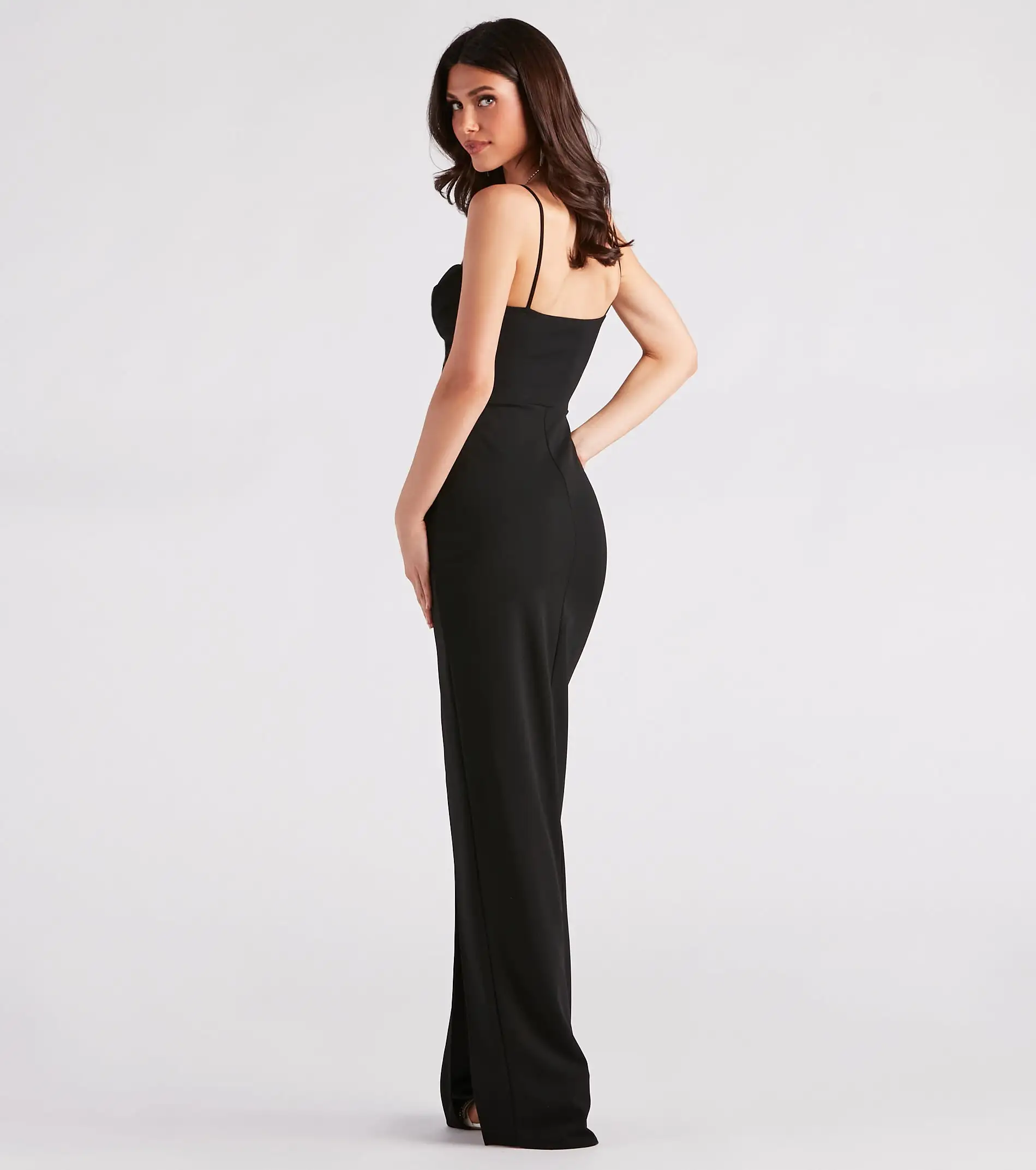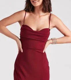 Chic, sultry, and showstopping, the Justine formal crepe dress is a stunning style for dinner banquets, ceremonies, and anniversary parties! She features a sleeveless sweetheart neckline with a lovely cowl draping, spaghetti straps, a padded bust, a hip-hugging slim silhouette, and a sexy high front slit along her floor-length hem. The formal dress is composed of a lined crepe fabric with minimal stretch. Complete the look with an