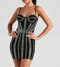 You’ll bring the glitz and glamour to your formal party look in the sultry Kalani mini dress! She features a sleeveless sweetheart neckline, a corset-style bodice with structured cups, adjustable spaghetti straps for a customized fit, iridescent rhinestones in a linear embellished design, and a short, curve-hugging, bodycon silhouette. The mesh fabric offers a moderate stretch with a knit lining. Complete the outfit with