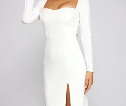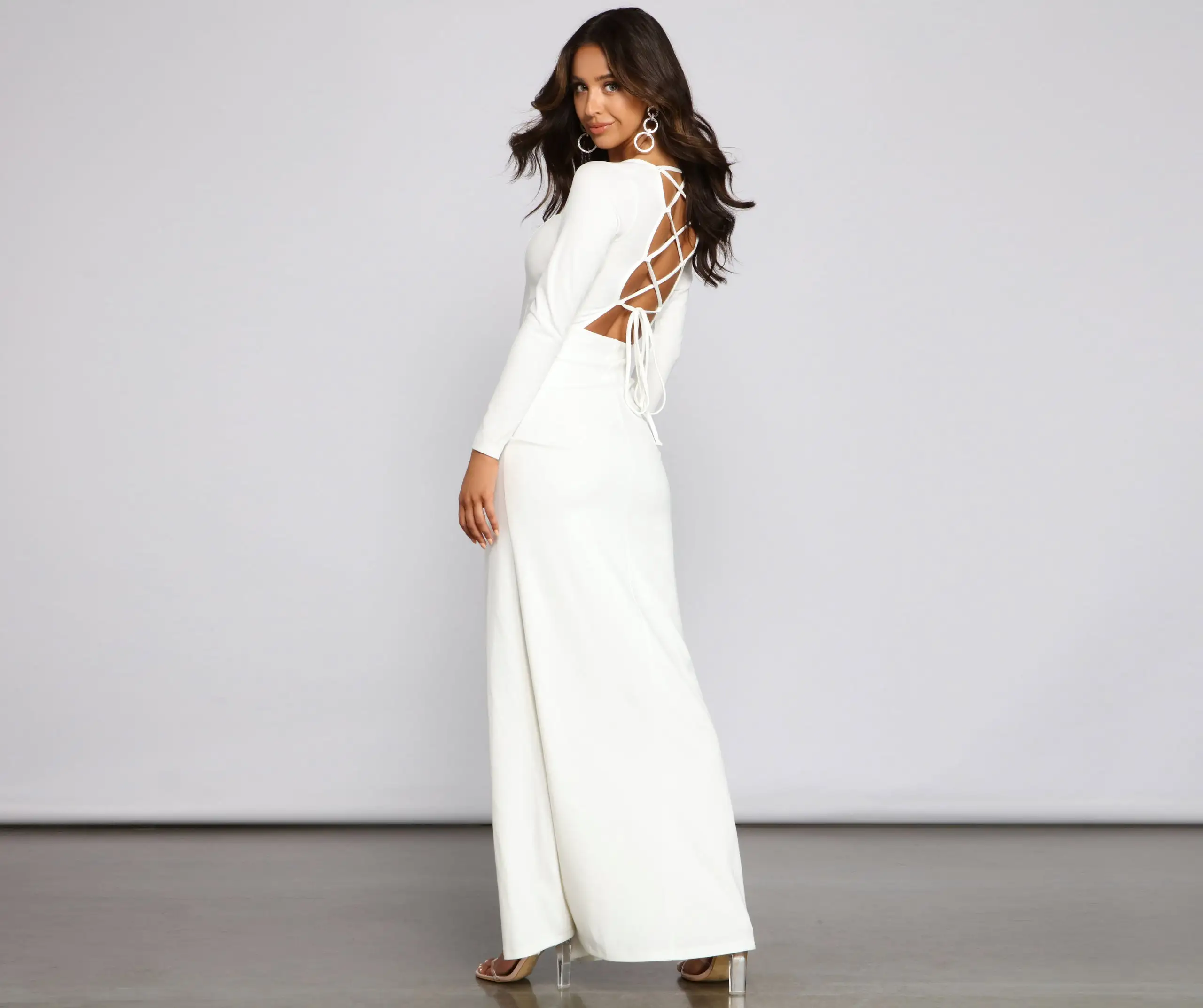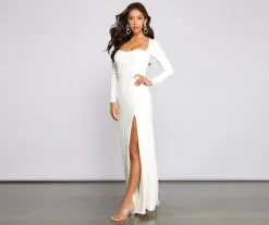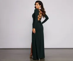Look oh-so-stunning and create a gorgeous silhouette in the beautiful Kayla formal dress! She features long fitted sleeves, a subtle sweetheart neckline, and a sexy open back with a lace-up design. Her slim-fit bodice flows out to a floor-sweeping length with a thigh-high slit. Pair this dress with a