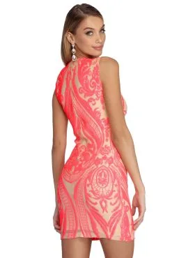 Dazzle as you glow in our spotlight ready Kiki dress! She features a combination neon coral with beige color, a high round neckline and tank-like straps. Her slim fit bodice leads to a curve hugging mini length silhouette to show off your heel game! Dress is composed of a lined mesh fabric that is adorned with sparkling sequins set in a baroque inspired pattern. Garment offers a slight stretch and includes a back zipper closure.