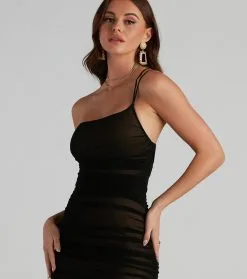 Elegant with sultriness, the Laura formal dress is ready to make her debut at the party! She features a sleeveless, one-shoulder neckline, dual adjustable spaghetti straps, and side ruched seams that create an hourglass appearance on her form-fitting silhouette. Showcase some skin with her sexy high-cut side slit along the floor-length hem. The formal dress is composed of a partially sheer mesh fabric with an inner knit lining and a moderate stretch. Complete your dressy look in doorknocker