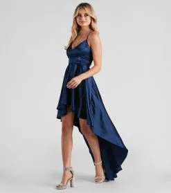 Show up and stun in the gorgeous and sleek Layla satin formal dress. She features a sleeveless V-neckline, a built-in padded bust that eliminates the need for a bra, spaghetti straps, and an open back with a chic lace-up strappy design for a customized fit. Her high waist seam leads to a floor-length skirt with a high-low hem and a flowy A-line silhouette. Complete the look with dazzling
