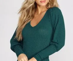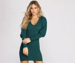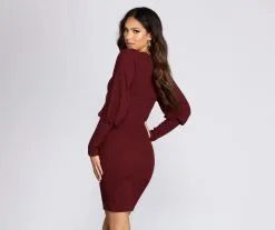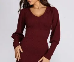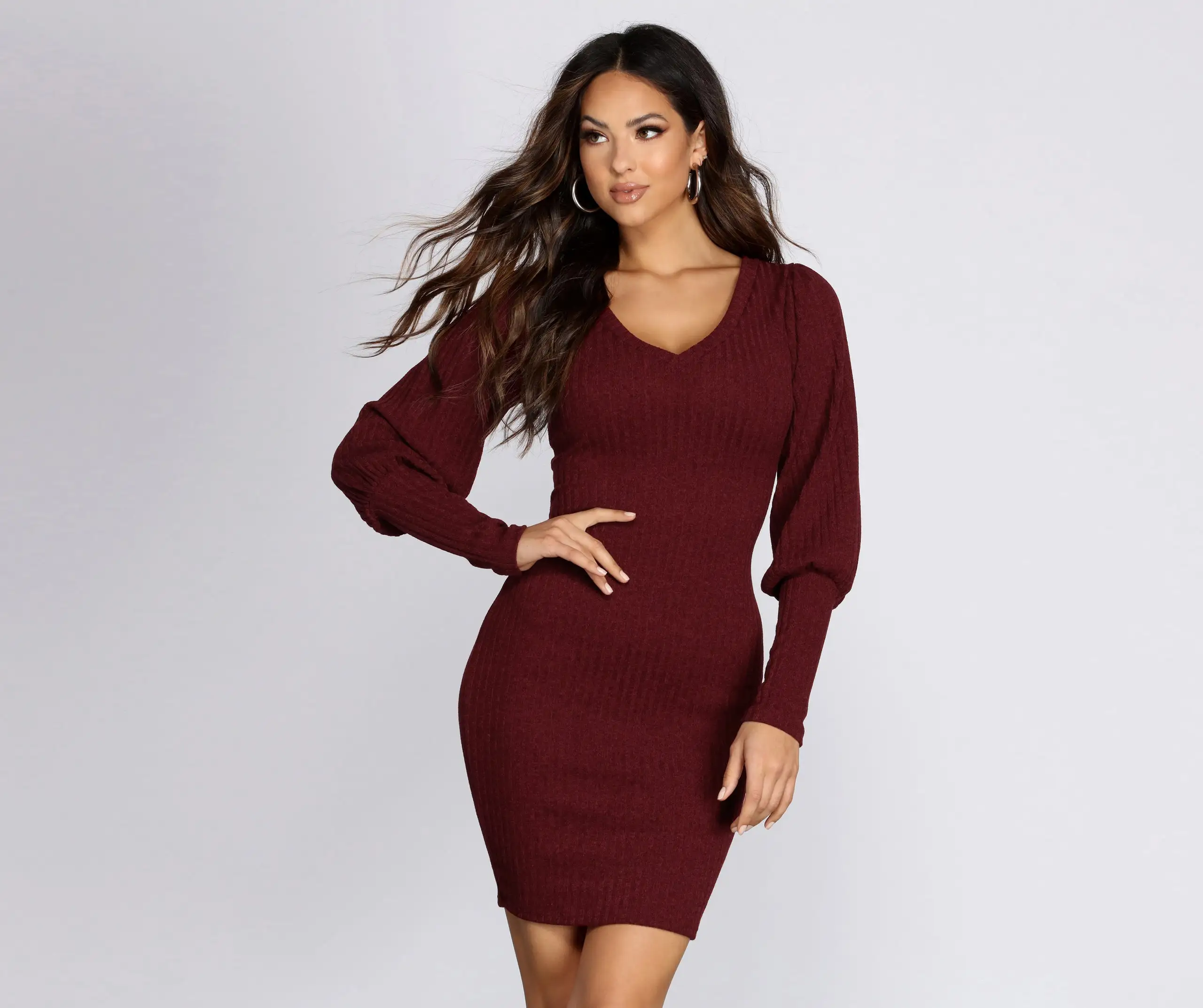 Keep it cozy with this pretty knit dress! It features a plunging V neckline, long puff sleeves and a mini length silhouette. Dress is composed of a ribbed knit fabric that offers a form hugging fit.
