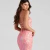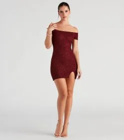 If you love to sparkle this glitter off-the-shoulder dress will have you shimmering all night! It features a bodycon silhouette, a front slit accent, and a mini-length hem. Complete the look in a