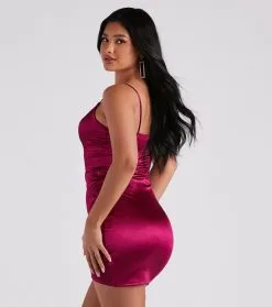 You’ll love to go out dancing in this satin short dress featuring a sleeveless V-neck, spaghetti straps, a princess seam bodice, bodycon fit, and a faux wrap asymmetrical hem with pleating. Complete the look in sassy