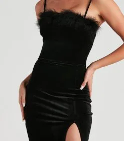 Make it a luxe affair in this stunning smooth velvet midi dress! It features a sleeveless square neckline with a chic marabou feather trim, spaghetti straps, a midi-length, curve-hugging silhouette, and a high front slit to showcase some leg. The velvet fabric offers a moderate stretch. Style with