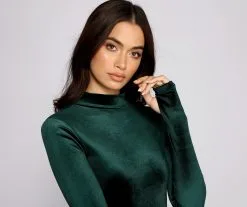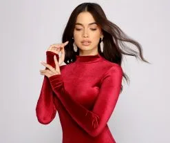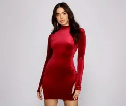 Stun in a luxe velvet dress for your next fancy date night with bae. The dress features a mock neck, a small keyhole at the back with dual button closure, long sleeves with thumb hole, and a sleek mini-length silhouette. The dress is composed of a lined velvet fabric that offers a form hugging fit with a slight stretch. Complete look with