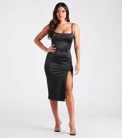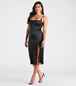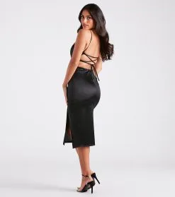 Your night is looking flawless and luxe in this satin midi dress perfect for a cocktail party! It features a sleeveless square neck, spaghetti straps that lace up in the back, and a form-hugging silhouette with a sultry front slit. Style with
