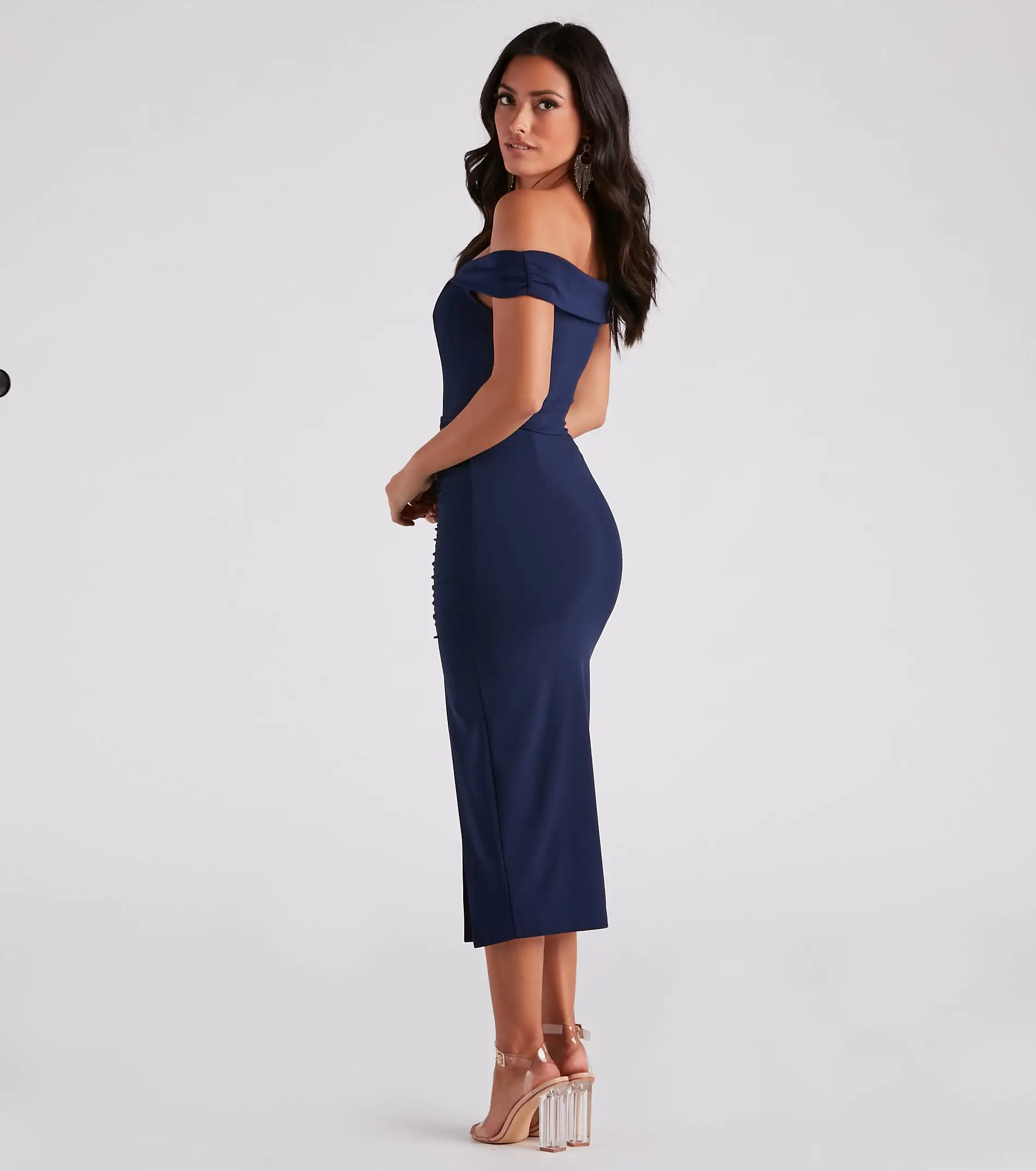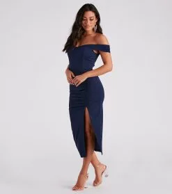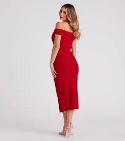 A closet staple for your upcoming weddings or dressy events, the Madi formal midi dress evokes a clean and pristine allure so you’ll always feel classy! She features an off-the-shoulder, sweetheart neckline, foldover short-sleeve cuffs, and a form-hugging silhouette with a front side ruched seam atop a sultry side slit along her midi-length hem. The formal dress is composed of a stretch-knit crepe fabric that hugs your body like a glove! Complete the look with twisted