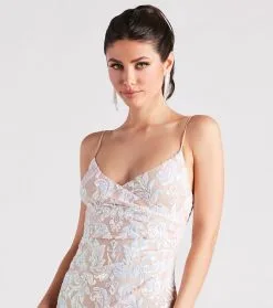 Sparkle up the night in the stunning Maeve sequin mini dress! She features a sleeveless V-neckline with a wrap-front design, adjustable spaghetti straps for a customized fit, ruching at the waist, a wrap-front skirt silhouette, and a short, form-hugging fit. The lined mesh fabric features all-over sequin embroidery in a chic scroll pattern. Style with
