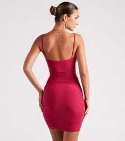 Make your move out on the dance floor in this sassy mini dress sure to get all the attention! The sleeveless dress features a surplice V-neckline, spaghetti straps, and side and front ruched seams that define your curves along the bodycon fit. Complete the look with a