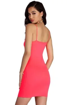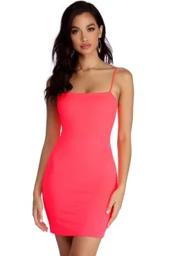 Make a flirty appeal in neon! This must have mini dress features a neon coral hue, a square neckline, narrow shoulder straps and a mini length. The fitted dress is composed of a lined scuba fabric that offers a moderate stretch.