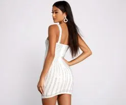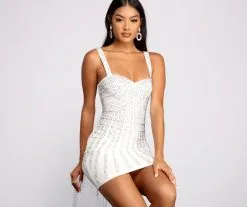 Heat up the night in this stunning bodycon that shines from every angle. The dress features a sleeveless sweetheart neckline, narrow shoulder straps, allover heat stones, and a mini length silhouette. The dress is composed of a lined mesh fabric that offers a bodycon fit with a moderate stretch. Complete your look with rhinestone earrings and