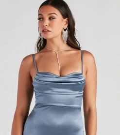 Reign the night with a stunning midi dress that elevates your night-out look! The dress features a sleeveless cowl neckline, spaghetti straps, and a midi silhouette accented with an asymmetrical high slit. The dress is composed of a satin-like fabric that offers a form-hugging fit with a moderate stretch. Complete look with