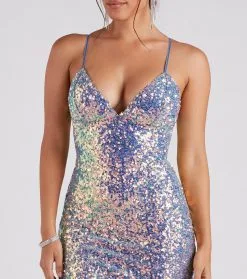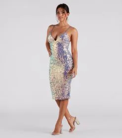 Shine bright like a diamond in the Rhianna formal dress covered in iridescent sequins to wow from head to toe at banquets or bachelorettes! She features a sleeveless V-neckline, adjustable spaghetti straps, a padded bust, a flattering bodycon silhouette, back slit accent, and a midi-length hem. The formal dress is composed of iridescent sequin-embellished mesh fabric that causes a rainbow-like color effect under lights and is designed with a smooth knit stretchy lining. Complete the look in a