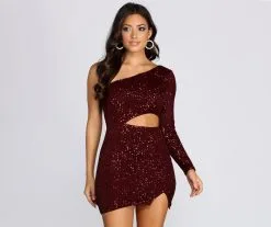 Keep it sassy in sparkling sequins! This mini dress features a one shoulder neckline with built in no slip strip, a fitted long sleeve, a sexy side waist cut out and a mini length silhouette accented with a mini side slit. Dress is composed of a lined mesh fabric adorned with sequins throughout. Dress offers a curve hugging fit with slight stretch. Includes a back zipper closure.