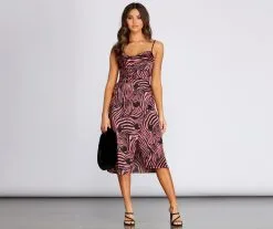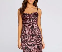 You love to make a bold fashion statement, and this zebra print midi will not disappoint! It features a sleeveless bodice, adjustable spaghetti straps, a cowl neck, a square back with a hidden zipper and hook and eye closure, a wrap front with a slit, and a mid-length, flowy fit. The satin-like fabric has no stretch.