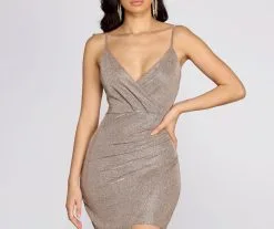 Showcase stunning looks in this beyond gorgeous glitter knit mini dress! It features a wrap front V neckline, high waist seam, and a wrap front skirt with a short asymmetrical hem and ruched detailing. Pair this shimmering dress with a