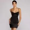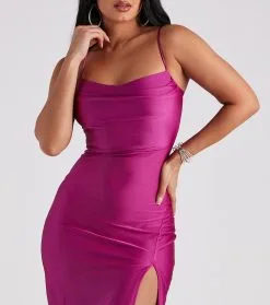 Simple and sleek, this smooth knit midi dress is a perfect choice. It features a sleeveless cowl neckline, spaghetti straps, a high waist seam, a fitted, A-line silhouette, and a chic high front slit to showcase some leg. Style with embellished