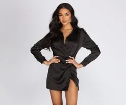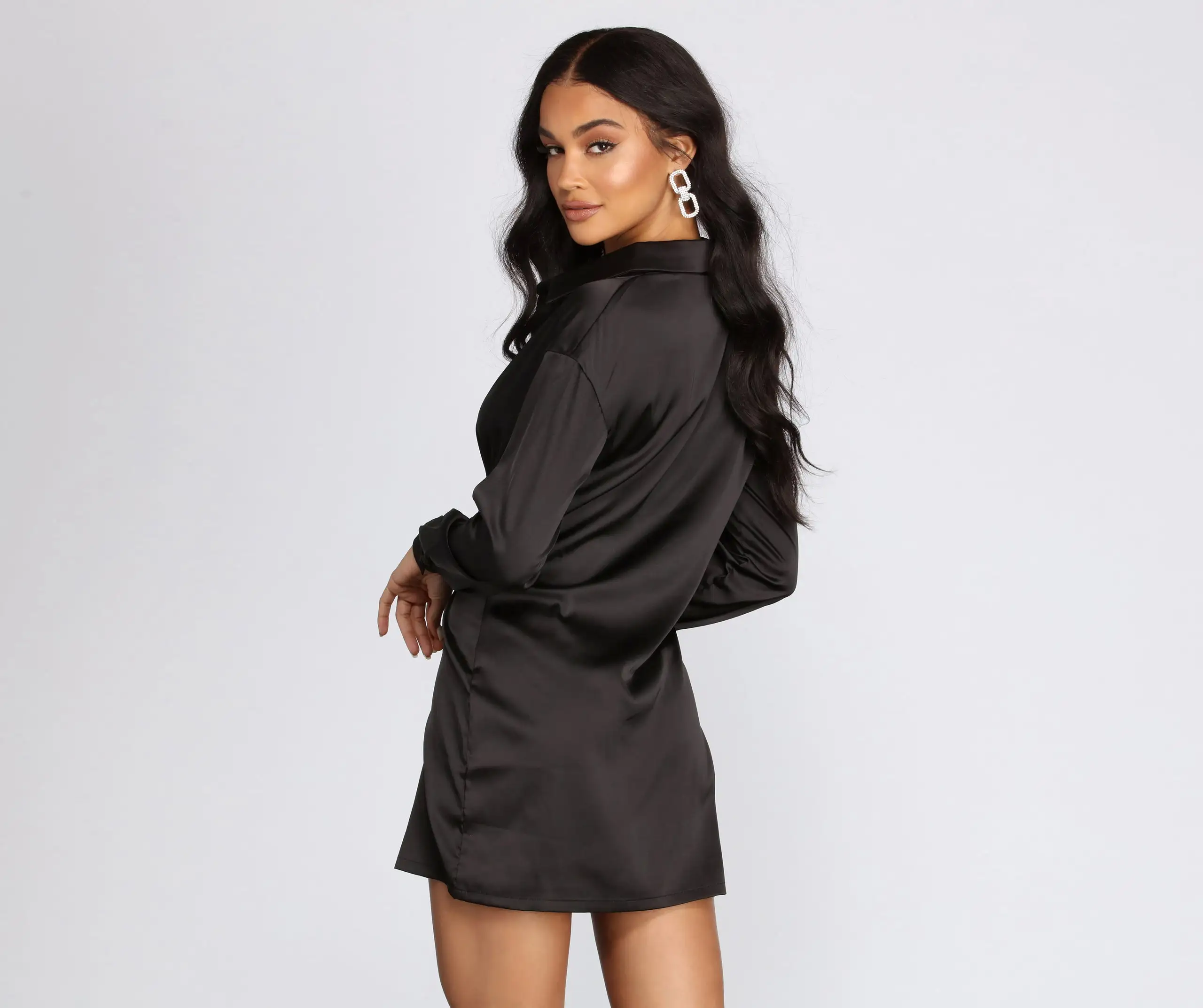 Wrap yourself in sleek satin to make a stunning statement! The shirt dress features a flat collar with a plunging V neckline with subtle pleated detailing, long sleeves with a single button cuff and a mini length asymmetrical silhouette. Dress is composed of a satin-like fabric that offers a relaxed fit with minimal stretch.
