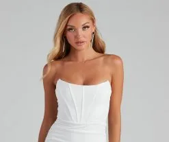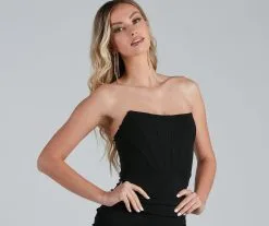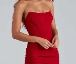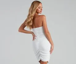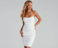 Showcase your status as a chic stunner in this must-have mini dress! It features a strapless scoop neckline, a corset-designed top with flexible boning to provide structure while enhancing your curves with ruched detailing, and a mini-length on a curve-hugging silhouette. Complete the outfit with a pair of sparkly earrings and a