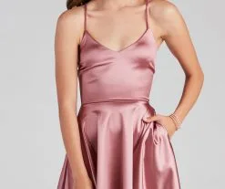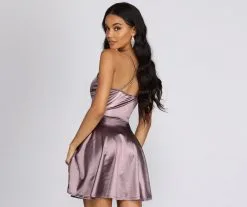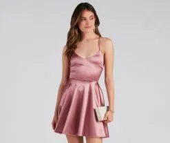 Keep it stunning and stand out in chic satin! This skater dress features a sleeveless V-neckline, spaghetti straps that lead to a cross-back design, a high waist seam, a short skater skirt, and a flirty fit and flare silhouette. Style this dress with